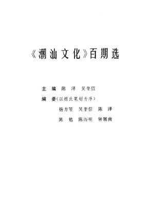 《潮汕文化》百期选本书以潮汕文化精神为主线,通过具体的故事,用哲学和心理学的方法,剖析潮汕人文精神的两重性,革新潮汕传统文化,为潮汕文化注入新精神。